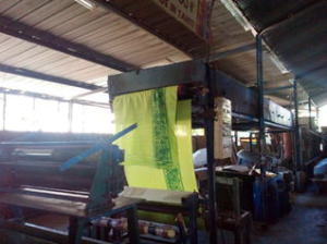 左の写真は、1枚1枚、手作業で布に柄をつけているとことです。 大きな版画みたい。