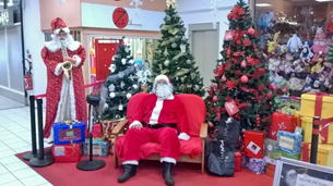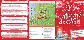 地図上で赤く印がつけられている通りが一時的に歩行者天国になり、クリスマスプレゼントの他に様々な出店があります。右側の写真は、気さくに通行人にプレゼントを配るサンタクロース。 |