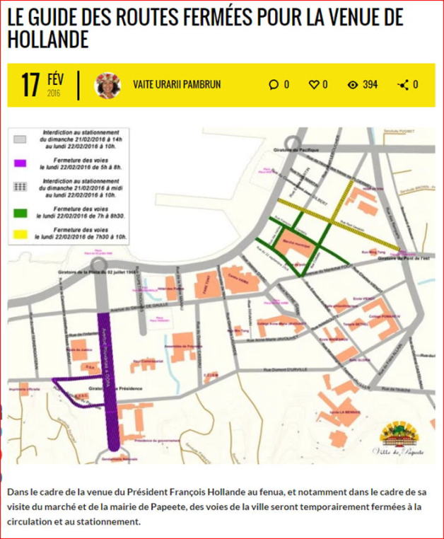 視察は2月22日月曜日、警備のためパペーテ市内の道路は交通規制があり、21日午後2時より市内中心部は駐車禁止、22日は時間によって封鎖される道路がありますので、観光の際にはご注意下さい。 |
