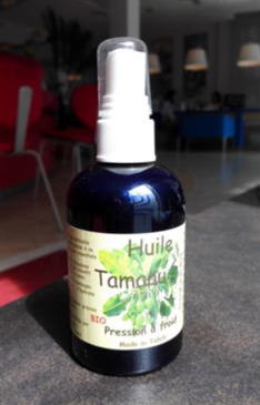 タマヌオイルはタヒチのスーパーや薬局で購入可能で、こちらの写真以外にも多数のメーカーから発売されており、どれもメイドインタヒチ、100%ナチュラルです。