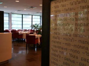 マナバスイートタヒチのバーとレストランの壁のデザインには、アルファベットが使われており、それをよく見ると単語がいっぱい並んでいます。