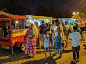 会場の周辺には、タヒチの工芸品や服などの出店がありますが、食べ物を販売するお店は、チュロスしかありませんでした。 |