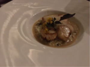 下の写真はホタテ貝、地元の貝やムール貝のリゾットで、生姜とレモングラス風味のタイ風ココナッツソース。