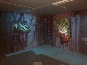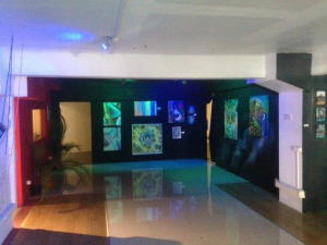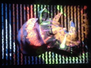 ライトによって数秒おきに室内の色が変化したり、壁に描かれた絵にプロジェクターの光りがあたり、次々に映像が変わったり。