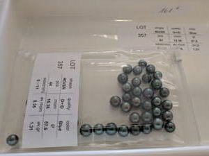 生産者、形、大きさ、色、品質と、細かく選別された黒真珠が並んでいて、参加者が自由に品定めを出来るように、個別のトレーに載っています。