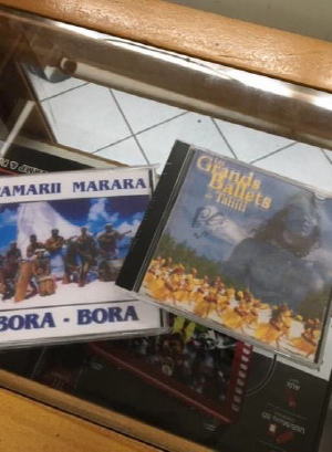 有名な歌手やタヒチアンダンスグループのCDが棚に陳列されています。