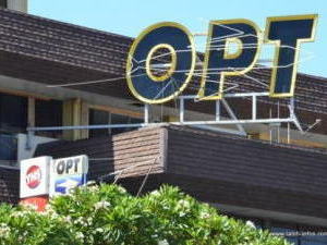 パペーテ市内の郵便局は、ポマレ大通りという海側のメイン通り、ファレトニーショッピングセンターの並びに位置している、「OPT」という大きな看板が目印です。