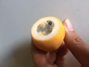 小さい種が沢山入っており、パッションフルーツにソックリな食感でしたが、酸味は少なくて甘く、とても美味しかったです。