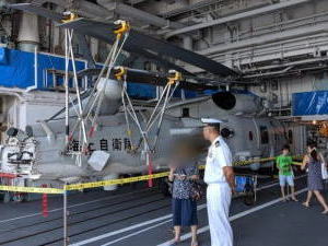 哨戒ヘリコプターも、ローターが折りたたまれた状態で見学することができ、子どもたちは、ヘリコプターって畳めるんだね!と目を丸くしていました。 |