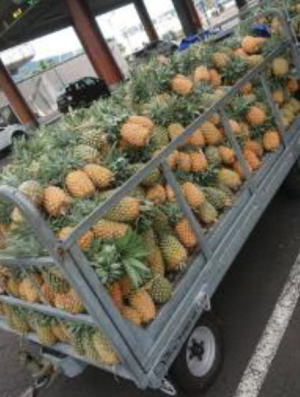 モーレア島で栽培されたパイナップルの一部はタヒチ島に運ばれてきて、街中のマルシェやスーパー、道端で販売されています。