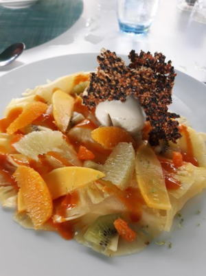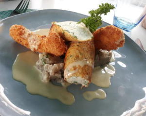 左上の写真は、マヒマヒシイラのすり身ハンバーグとカボチャのフライ、こぶミカンと白ワインのソース。