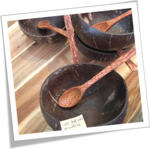 ココナッツの実で出来たお椀と、お店の名前が入ったココナッツスプーンです。